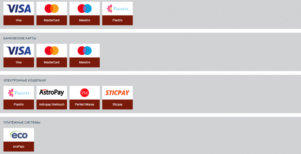Платёжные методы и способы депозита и вывода: