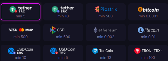 На текущий момент представлены самые популярные средства для депозита и вывода средств, такие как карты (Visa/Master Card/МИР), электронный кошелёк (Piastrix), а также все популярные криптовалюты. Вывод средств в среднем занимает от 5 минут до 1 часа, в некоторых случаях процесс может быть чуть дольше.