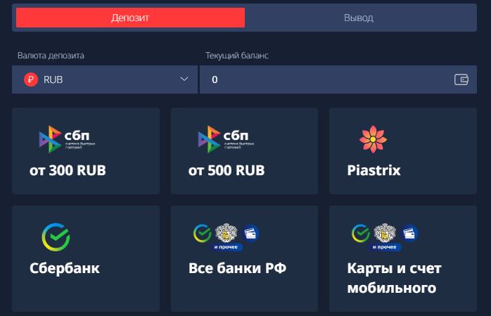 Внести и получить средства можно следующими способами указанными на сайте (в зависимости от выбранной валюты и страны). На данный момент в казино представлены самые популярные средства для депозита и вывода средств, такие как карты (Visa/Master Card/МИР), электронный кошелёк (Piastrix), а также все популярные криптовалюты. Для использования депозита в крипте, нужно создать отдельный счёт в нужной вам валюте!