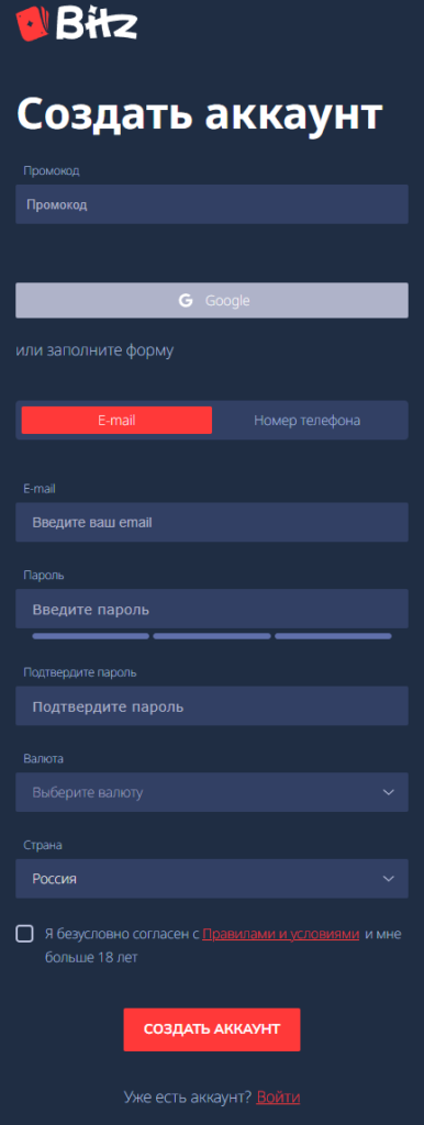 - указать адрес электронной почты (или номер телефона, если выбрали данную опцию регистрации)