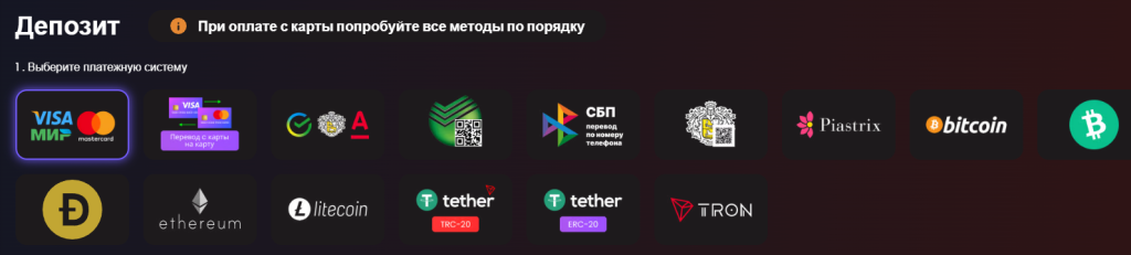 Казино принимает и выплачивает выигрыша на популярные электронные кошельки и банковские карты (МИР, VISA/Master Card, Piastrix и т.д), так же игроки могу вносить и выводить средства с использованием криптовалюты. Минимальные депозит и вывод составляет всего 100 рублей (в зависимости от выбранного способа). Время вывода средств быстрое!