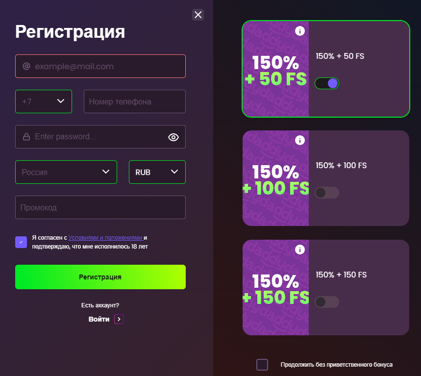 150% бонус на первый депозит + 50 фриспинов