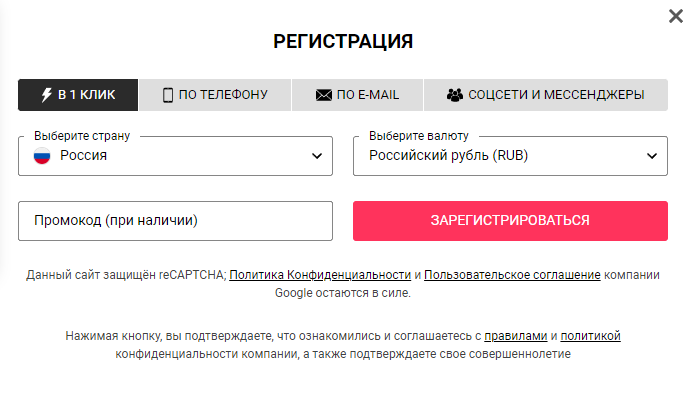 - Регистрация в 1 клик, игроку нужно лишь указать страну проживания и валюту, после чего ему будет предоставлен логин и пароль для входа