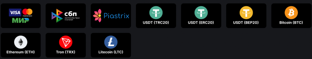Казино принимает и выплачивает выигрыша на популярные электронные кошельки и банковские карты (МИР, VISA/Master Card, Piastrix и т.д), так же игроки могу вносить и выводить средства с использованием криптовалюты.