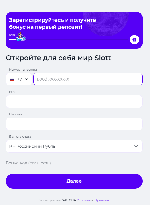 Регистрация в Slott casino не займёт у вас много времени, всё что необходимо указать: