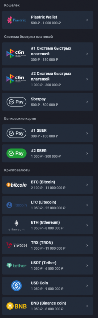 Способы пополнения и выплаты выигрышей: