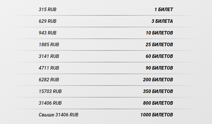 Билеты предоставляются в качестве бонуса за сделанную ставку. Разумеется, чем крупнее ваша ставка, тем больше билетов вы получите. Если ваша ставка превышает сумму: